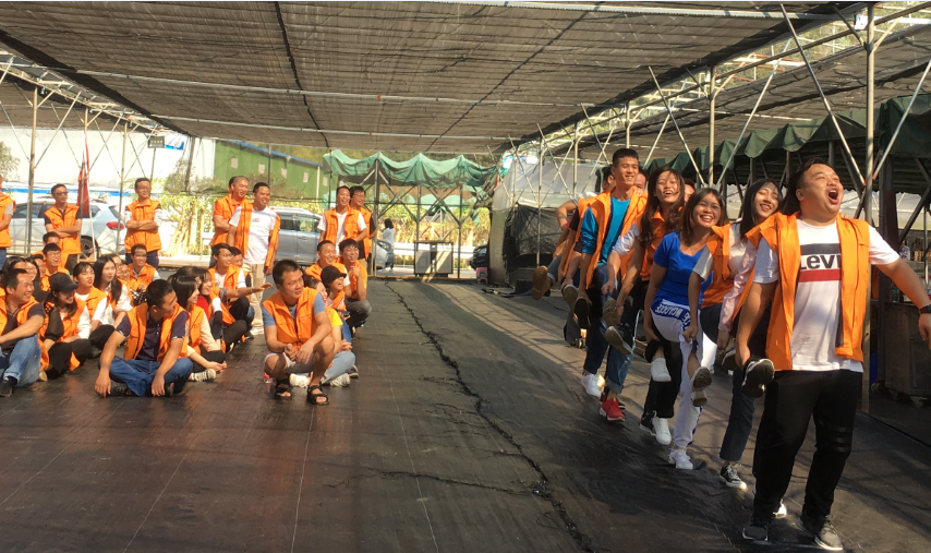 游戲環(huán)節(jié)一,人員共分為六個小組,每個小組由組長帶領(lǐng)隊員討論自己的隊歌口號以及隊伍造型,在單位時間內(nèi)完成,并進行展示比拼。